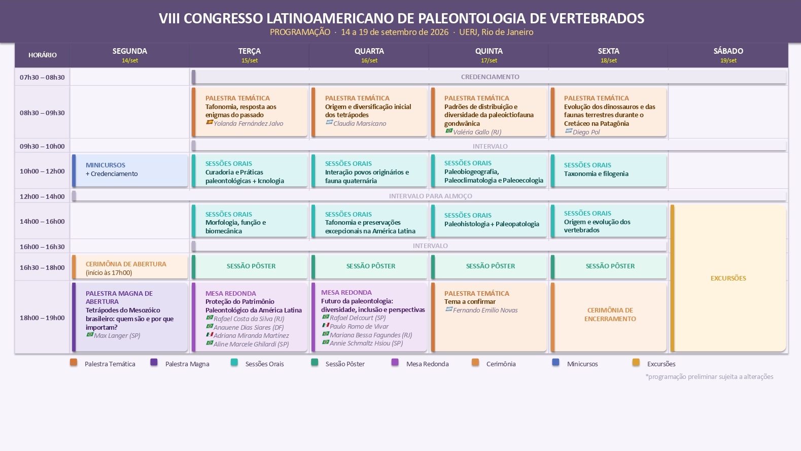 A Comissão Organizadora do VIII CLPV está trabalhando com muita dedicação, foco, respeito e alegria para a entrega de um evento de alta qualidade técnico-científica à comunidade paleontológica latinoamericana. Além disso, o grupo organizador tem convidado muitos esforços para que os dias 14, 15, 18 e 19 de setembro de 2026 sejam inesquecíveis para todos que vierem ao congresso. A cidade do Rio de Janeiro, a UERJ e a Comissão Organizadora do evento estão ansiosos e esperam de braços abertos por sua chegada. Mais uma vez, sejam muito bem-vindos à cidade maravilhosa!